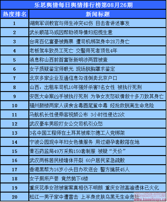 2014年8月26日乐思每日舆情热点排行榜导读:湖南军训教官与师生冲突42伤 目击者讲述事发;武长顺落马或因帮助领导情妇招揽生意;台湾百亿富豪被撕票 遭司机绑架身中28刀身亡;老板驾车致员工死亡 交警用死者顶包4年;消息称山西前首富张新明涉两罪被查……