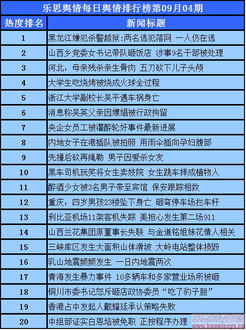 2014年9月4日乐思每日舆情热点排行榜导读:黑龙江嫌犯杀警越狱:两名逃犯落网 一人仍在逃;山西乡党委女书记带队砸饭店 涉事9名干部被处理;河北:母亲残杀亲生骨肉 五刀砍下儿子头颅;大学生吃烧烤被烧成火球全过程;浙江大学副校长吴平遇车祸身亡……