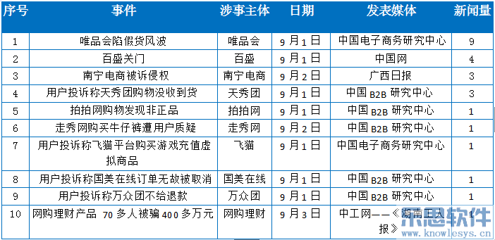 乐思舆情监测中心电商行业负面预警板块数据显示:本周,电商行业关注度最高的舆情事件是“唯品会陷假货风波”,涉及企业“唯品会”。该事件新闻报道量达9篇,位列电商行业负面预警榜第一位。“用户投诉称天秀团购物没收到货”、“百盛关门”分别位居电商负面预警榜第二、三位。