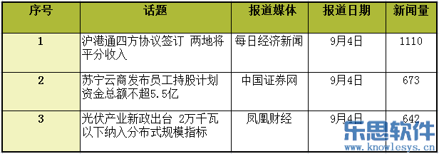 据乐思舆情监测中心金融行业热点话题版块数据显示:本周金融行业舆情话题关注度最高的是“沪港通四方协议签订”。该话题新闻报道量达1110篇,位居金融行业热点话题排行榜第一位。“苏宁云商发布员工持股计划”、“光伏产业新政出台”分别居金融行业热点话题排行榜第二、三位。
