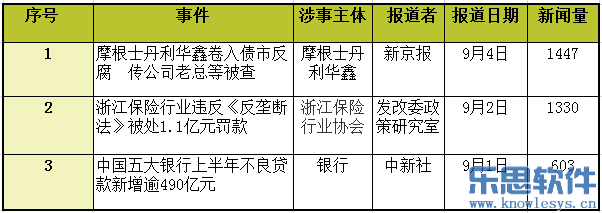 据乐思舆情监测中心金融行业负面舆情版块数据显示:本周金融行业负面舆情关注度最高的事件是“摩根士丹利华鑫卷入债市反腐”,涉及企业“摩根士丹利华鑫基金”。该事件相关新闻报道量达1447篇,位列金融行业负面舆情排行榜第一位。“浙江保险行业违反《反垄断法》被处1.1亿元罚款”、“中国五大银行上半年不良贷款新增逾490亿元”分别居金融行业负面舆情排行榜第二、三位。