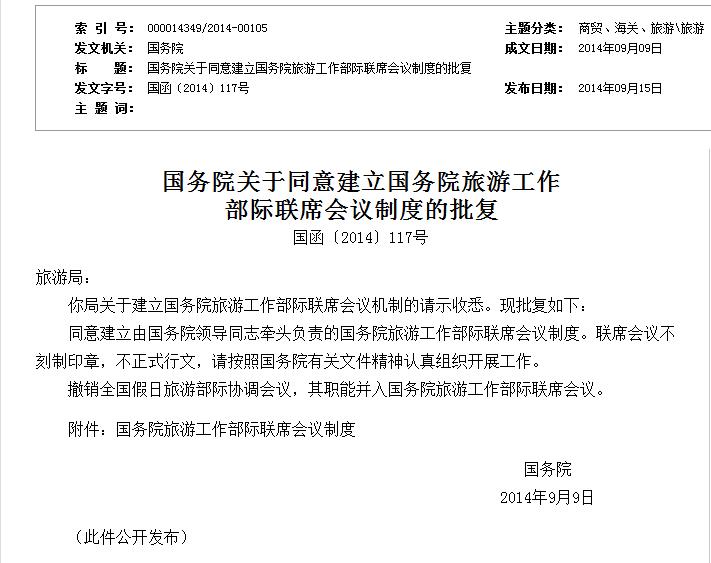 运行14年后,全国假日旅游部际协调会议于9月15日正式撤销,其全部职能并入新设机构国务院旅游工作部际联席会议制度之中。9月15日,中国政府网发布消息称,国务院已批准建立国务院旅游工作部际联席会议制度。新组建的国务院旅游工作部际联席会议,包括成员单位28个。