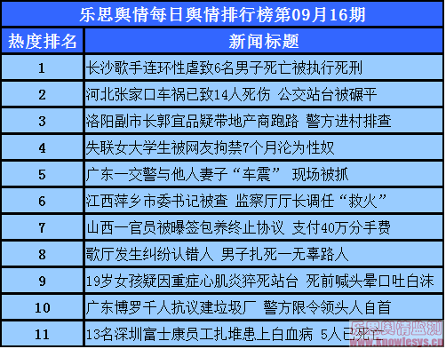 2014年9月16日乐思每日舆情热点排行榜导读:长沙歌手连环性虐致6名男子死亡被执行死刑;河北张家口车祸已致14人死伤 公交站台被碾平;洛阳副市长郭宜品疑带地产商跑路 警方进村排查;失联女大学生被网友拘禁7个月沦为性奴;广东一交警与他人妻子“车震” 现场被抓……