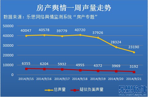 根据乐思网络舆情监测系统房产专题监测数据显示:从9月15日至21日,房地产相关舆情信息总量达250564条,其中疑似负面信息344979条,占总信息量的14%,舆情信息总量及疑似负面信息量较上周都有所上升。房产舆情最高峰出现在19日,本周房产舆情关注度较高,周一至周五日均舆情信息量保持在4万条左右,双休日房产舆情声量开始出现较大下滑至3万以下。在众多舆情事件中,“中新集团原总裁被调查”和“全国掀起第二轮救市潮”受到较高的关注。