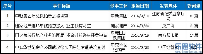 乐思舆情监测中心房产行业负面预警板块数据显示:第0915~21周,房地产行业关注度最高的舆情事件是“中新集团原总裁柏贵之被调查”,涉及企业中新集团。该事件一周新闻报道量为31篇,位列房地产行业本周负面预警榜第一位。“链家地产连环单被指忽悠人”、“日之泉资金链断裂多楼盘被查”分别位居房产行业本周负面预警榜第二、三位。