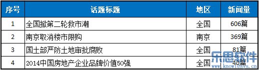 乐思舆情监测中心房地产行业热点话题板块数据显示:第0915~21周,房地产行业关注度最高的舆情话题是关于“全国掀第二轮救市潮”话题的议论。该话题一周新闻报道量达606篇,登上房地产行业热点话题新闻榜第一位。“南京取消楼市限购”、“国土部严防土地审批腐败”也获得加高的舆情关注,分别位居房地产行业热点话题新闻榜第二、三位。
