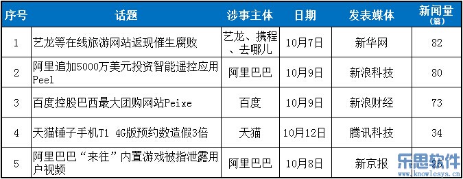 乐思舆情监测中心电商行业行业热点话题板块数据显示:1006~12期电商行业行业关注度最高的舆情话题是关于“艺龙等在线旅游网站返现催生腐败”话题的议论。该话题一周新闻报道量达82篇,登上电商行业新闻报道热点话题榜第一位。“阿里追加5000万美元投资智能遥控应用Peel”和“百度控股巴西最大团购网站Peixe”也受到媒体的较大关注,分别以80篇和73篇的新闻报道量位居电商行业新闻话题榜第二、三位。