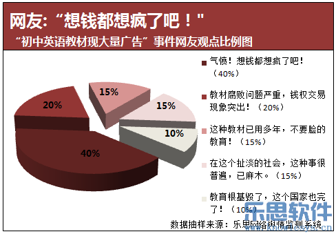 据乐思网络舆情监测系统监测数据显示,不少网友直呼某些人“想钱都想疯了!”,甚至一些网友表示这种现象很普遍,教材腐败问题早就存在,已司空见惯。
