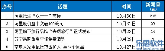 乐思舆情监测中心电商行业行业热点话题板块数据显示:1027~1102期电商行业行业关注度最高的舆情话题是关于“阿里抢注“双十一”商标”话题的议论。该话题新闻报道量达208篇,登上电商行业行业新闻报道热点话题榜第一位。“阿里股价盘中突破100美元”和“阿里旗下旅行品牌“去啊旅行”正式发布”也受到媒体的较大关注,分别位居电商行业行业新闻报道话题榜第二、三位。