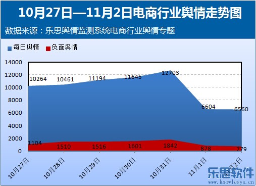 根据乐思网络舆情监测系统“电商行业”专题第1027~1102期显示,本周电商行业相关舆情总信息69431条,疑似负面信息9230条,占总信息量的13%。较上周,本周电商舆情总声量和疑似负面声量出现微弱上升,疑似负面信息传播主要集中在搜索引擎、微信、新闻和论坛平台。在众多舆情事件中,“阿里抢注‘双十一’商标”和“阿里股价盘中突破100美元”受到较高的关注。