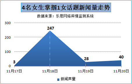近日,一段4名女生掌掴1女生的视频在网上流传,引发媒体围观和网友热议。视频中,四个女孩围住一个穿黄色衣服的女孩,不断对其殴打,其中一名打人者还不断重复一句话“知道人家有对象不?”一位男生笑着拍摄全程,并且煽风点火。据乐思网络舆情监测系统采集的信息显示,该视频最早在博客曝出,17日被媒体关注并报道,从而迅速引爆舆论。截至11月20日,该话题新闻报道达318篇,微博议论2849条,百度7日搜索指数达124720次。对于出现如此暴力的校园事件,舆论声讨声一片,不少言论把矛头指向了现行教育问题。