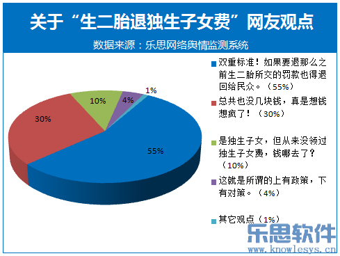 据乐思网络舆情监测系统监测数据显示,网友言论几乎是一边倒,认为“生二胎就要退独生子女费”的规定太过荒唐。超半数网友认为河南方面的做法是双重标准,表示如果要退独生子女费,那么之前未开放二胎时生二胎所交的罚款也应该退回给民众。也有3成网友认为,独生子女费总共就那么几块钱,河南政府还要求退,真的是想钱想疯了。另外,亦有一些网友表示自己虽是独生子女,但从来没领过独生子女费,质疑该费用去向。