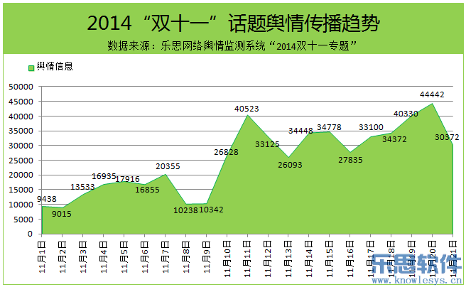 据2014双十一话题舆情传播趋势图可知,该期间“双十一”话题舆情信息每日都保持在9000条以上,其中最低的是11月2日的9015条。11月9日至11月11日,“双十一”舆情关注度呈直线上升趋势,11日当日,伴随着电商、消费者和媒体的狂欢,舆情关注度达到第一次的高潮,舆情信息达40523条。随后两天逐渐回落,虽然回落,但信息量仍然很大,并没有因11月11日的结束而急剧减少。之后几天,随后网友吐槽模式的开启和媒体对“双十一”总结报道数量的日益增多,话题舆情关注度也呈波动上升趋势,11月20日,达到舆情传播的第二个高潮。