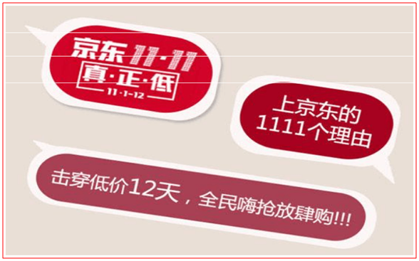 京东对准淘宝网被攻击的软肋——“假货”出招,一系列“同是低价买一真的”、“买到假货了吧”等广告也在网上进行“狂轰滥炸”式投放。另外,京东宣布“双十一”从11月1日至11月12日“击穿低价12天”,在官网、移动客户端等平台同步发起。值得注意的是,今年“双十一”京东联手腾讯,上微信可直接链接进京东商城。
