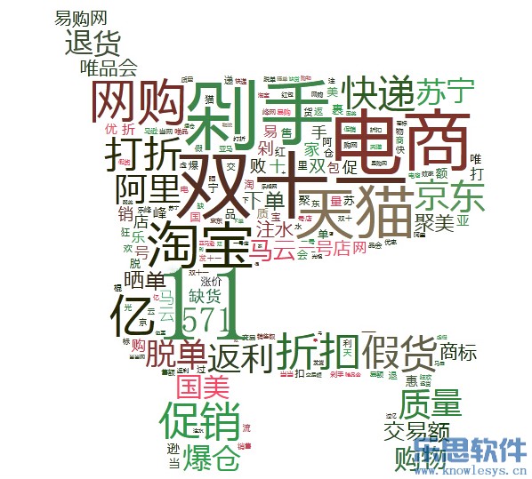 “双十一”热词分布图上,“双十一”、“11”、“剁手”、“电商”等词成为2014双十一期间的最热关键词;其次,天猫、淘宝、京东、苏宁、国美等国内大佬级电商名字也赫然在列,双十一前期堪称病毒式的营销效果可见一斑,尤其是天猫,其热度值非常之高;而“折扣”、“打折”、“促销”、“返利”、“质量”、“假货”、“快递”等热词也表明双十一期间消费者最为关注和吐槽的还是商品的价格、质量和快递服务问题;另外,“571亿”、“交易额”、“注水”、“阿里”等热词,也可以看出双十一期间电商平台的交易数据占有媒体双十一报道版面的一定比例,而阿里实时公布的交易数据更是引爆互联网,大小媒体纷纷发布转载。“爆仓”等快递状况、“剁手党”疯狂晒单的行为等也都成为了双十一后期新闻媒体报道的聚焦点。而“假货”“涨价”等词再一次表明今年双十一虚假折扣、质量等问题还是突出,被人吐槽和诟病。