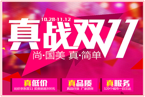 今年“双十一”,国美紧盯京东商城,广告更是打出“比价京东双11,买贵就赔300元”的宣传口号。同时也从“假货”问题入手,号称真品质。国美从10月28日起就开始低价促销,直至11月12日,声明“真战11.11”。