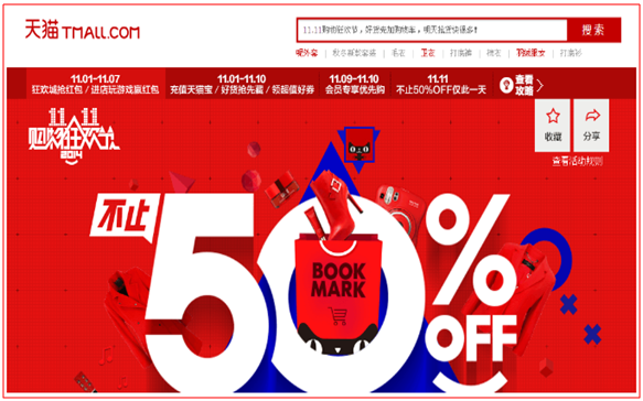 从10月15日开始,天猫便开启预售,登陆天猫或者淘宝网首页,“双十一”购物狂欢节的广告几乎占据所有版面。另外,天猫还在众多网站以各种形式投放广告。而淘宝手机平台则推出“11.11发现”主会场,随时随地浏览活动信息,领取亿元红包大礼。进入微博,各品牌官方微博也在为天猫宣传,或是链接进天猫店铺,或是优惠介绍等。双十一前期,天猫广告可以说是“狂轰滥炸”式投放。
