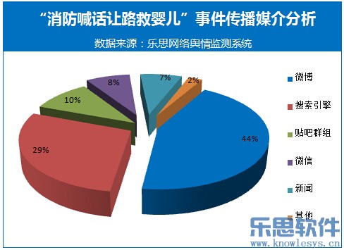 据乐思网络舆情监测系统监测数据显示,截至12月11日,陕西榆林绥德消防官兵的救人行为发生后,网络关于此事的舆情关注度随时间不断上升,尤其是在11日,事件舆情关注度大幅上升。而在事件的传播过程中,微博成为最主要的传播媒介,占44%比例。
