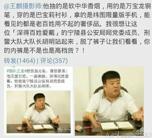 当晚,微博网友@王麒摄影师对微博图片发表质疑,称胡明一身奢侈品,“抽的是软中华香烟,用的是万宝龙钢笔,穿的是巴宝莉衬衫,拿的是纬图限量版手机,能看见的都是老百姓用不起的奢侈品”。随后,@平安宁陵关于“警队之星”的微博被删除,而网友@王麒摄影师也删除了质疑微博。