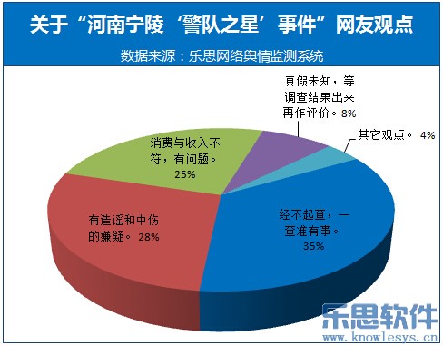 从对事件当事人宁陵县公安局党委委员、刑警大队大队长胡明的极力赞誉,到默默删除微博,宁陵县公安局官方微博的行为被网友称为“此地无银三百两”,而对当事人的赞美也被网友称为“信口开河”。据乐思网络舆情监测系统对事件的监测数据显示,逾6成网友对胡明表示质疑,在网友@王麒摄影师发表微博质疑图片中的胡明一身奢侈后,显然多数网友已经相信了@王麒摄影师的描述。尽管当事人在第一时间通过媒体澄清其所用物品并非奢侈品,并且相关单位已展开调查,但在如今我国不断有贪官被曝出、政府不被信任的环境下,不管事实真相如何,多数网友已经认为胡明存在问题。当然,也有近3成网友观察图片认为,当事人并非如网友@王麒摄影师所描述的那样一身奢侈,认为其一身奢侈有造谣和中伤的嫌疑。另外,亦有小部分网友表示真假未知,等事件调查结果出来再作评价。