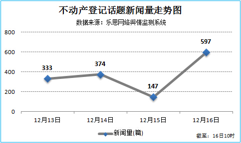 据乐思网络舆情监测系统“不动产登记”专题跟踪数据,从13日传出不动产登记明年3月实施开始,截至16日10时,该话题新闻报道量达1451篇,且整体报道量仍然成上升趋势,关注度依然走热。新浪微博该话题贴达139427条,其中微博用户“@新浪房产”该条博文被转发506次,评论129条。大V用户“@任志强”该微博的转发再次被转发336次,评论229条。在百度16日的实时热点排行榜中,“不动产登记3月实施”以39128次的搜索指数位列第三。