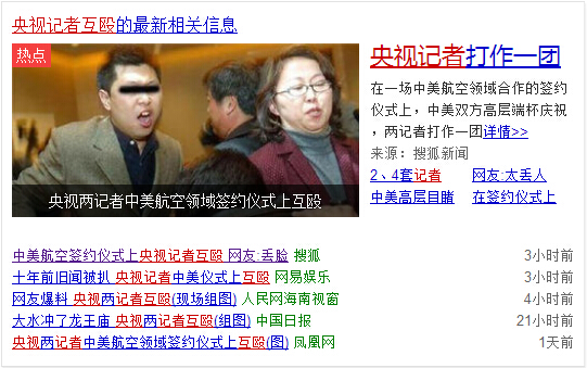 12月23日,新浪微博网友“@梦里醉了谁”以“中央电视台出事了”为题发博文称,前不久在北京东方君悦大酒店一场中美航空领域合作的签约仪式上,中美双方高层还在端着酒杯相互庆祝;那一边两位电视台的记者已经打作一团。中美两国的高层都在现场亲眼目睹了。有意思的是打过之后,双方在一起调解时才发现都是中央电视台的,一个是2套的、一个是4套的。为微博并配有现场图片。