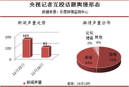 导语:12月23日,新浪网友“@梦里醉了谁”发微薄曝光央视记者互殴,该微博已发出立即引来网友强势围观,25日更是有多家媒体对该新闻进行了转载报道,“央视记者互殴”话题舆情关注快速上升。