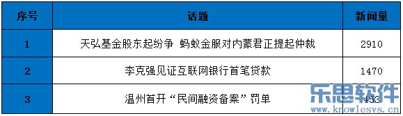 据乐思舆情监测中心金融行业热点话题版块数据显示:本周金融行业舆情话题关注度最高的是“天弘基金股东起纷争 蚂蚁金服对内蒙君正提起仲裁”。该话题一周新闻报道量2910篇,位居金融行业热点话题排行榜第一位。“李克强见证互联网银行首笔贷款”、“温州首开‘民间融资备案’罚单”分别居金融行业热点话题排行榜第二、三位。