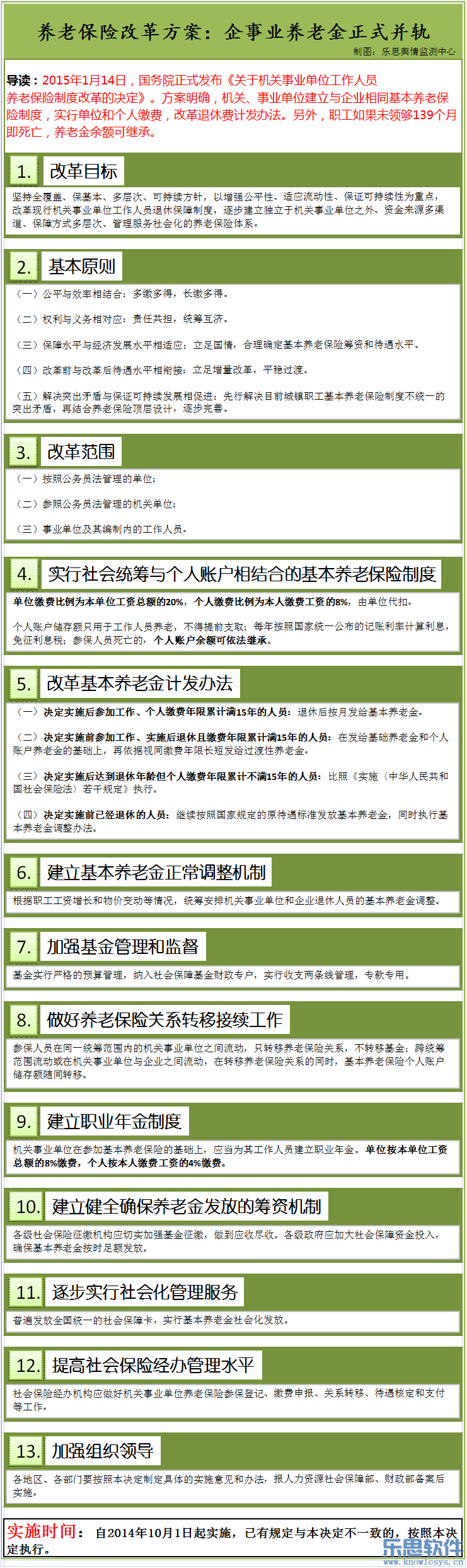 2015年1月14日,国务院正式发布《关于机关事业单位工作人员养老保险制度改革的决定》,机关事业单位养老保险改革方案正式出台。方案明确,机关事业单位建立与企业相同基本养老保险制度,实行单位和个人缴费,改革退休费计发办法。另外,职工如果未领够139个月即死亡,养老金余额可继承。具体见下图: