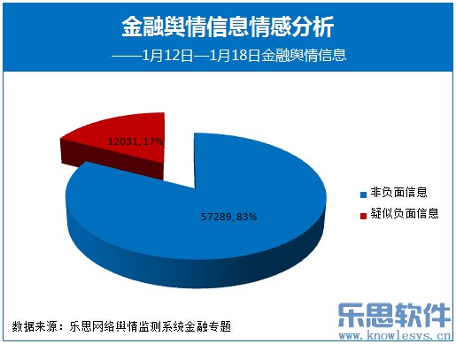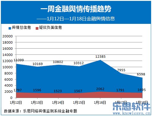 据乐思网络舆情监测系统监测数据显示,本周金融行业相关舆情总信息69320条,疑似负面信息12031条,约占总信息量17%。在众多舆情信息中,“央行:定向放水500亿支持三农小微融资”受到较高的舆论关注。