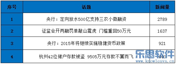据乐思舆情监测中心金融行业热点话题版块数据显示:本周金融行业舆情话题关注度最高的是“央行:定向放水500亿支持三农小微融资”。该话题一周新闻报道量2789篇,位居金融行业热点话题排行榜第一位。“证监会开两融罚单敲山震虎 门槛重回50万元”、“央行:2015年将继续实施稳健货币政策”分别居金融行业热点话题排行榜第二、三位。此外,“杭州42位储户存款被盗 9505万元存款不翼而飞”这一新闻也广受媒体和网友关注。