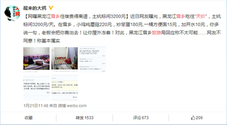 1月21日,人民网、新华网、京华时报、中国网、凤凰网等上百家媒体对该事件展开集中报道,一时间“天价土坑标间”迅速在网上走热,吸引大量网友跟帖关注。在微博方面,新浪微博网友“@ 醒来的大鸦”和“@ 新浪财经 ”转载分享了“黑龙江雪乡天价土坑标间”事件后,受到网友的纷纷转发跟帖评论,截止目前,“@醒来的大鸦”的该条微博转发量达1545次,评论687条。“@新浪财经”的博文被转载281次,跟帖297条。