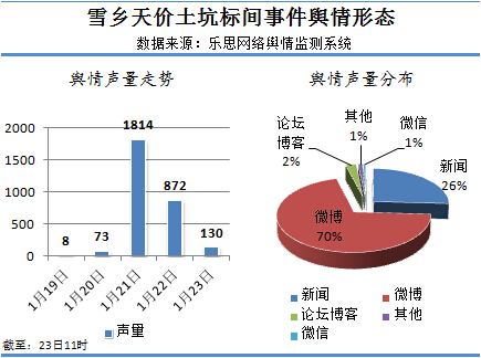 据乐思网络舆情监测系统“天价土坑标间”话题监测数据显示,截止1月23日11时,该话题以监测入库数据2889条,其中新闻报道748篇,占比26%。微博热议2023条,占比70%。微信、论坛、博客等平台话题热度较小。而从传播走势来看,19日该事件开始在网上传播,21日达到舆情传播的高潮,当天舆情声量为1814条,之后随着事件关注度的减弱,事件舆情声量开始回落,但仍有媒体和微博网友关注。23日,“天价土炕标间”仍以37987次的搜索指数位居百度今日热点的第19位。