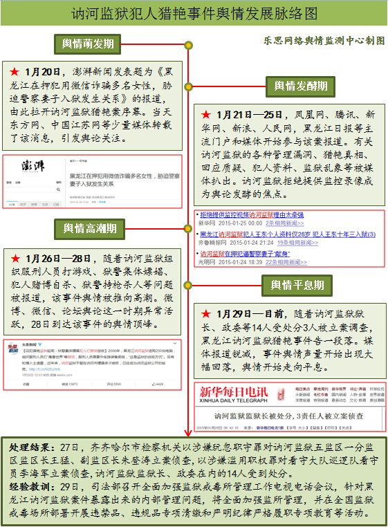 从1月20日澎湃新闻曝光讷河监狱猎艳事件开始,截至1月30日,该事件舆情仍旧在持续发酵。事件舆情危机的爆发经历着四个时期:舆情萌发期、发酵期、高潮期和平息期。随着28日媒体报道讷河监狱猎艳事件处理结果和29日司法部主持全国全国监狱戒毒所管理会议,该事件舆情开始逐渐冷却,走向平息。