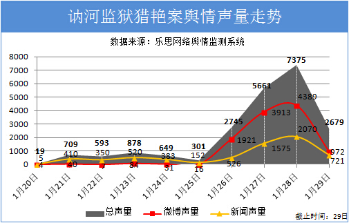 讷河监狱猎艳事件被媒体曝光后,迅速席卷网络,讷河监狱也被推倒了舆论的风口浪尖。一时间,媒体、微博、微信、论坛等各大媒介平台都关注和传播者讷河监狱的各种信息及一举一动,话题“讷河监狱犯人猎艳”长时间占据百度实时热点排行榜,事件舆情浪潮不断高涨。在此背景下,乐思网络舆情监测系统对“讷河监狱猎艳事件”实施了专题跟踪监测,截至1月29日,该事件相关舆情数据如下: