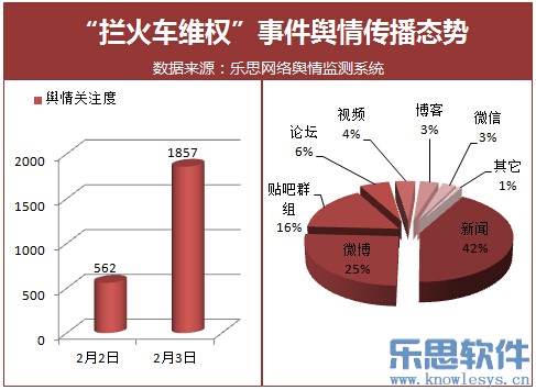 据乐思网络舆情监测系统数据显示,“河南业主拦火车维权”一事自2日下午@南阳同城会爆料、3日上午《华商报》报道后,迅速在网络各大平台传播开来,网络舆情关注度直线上升。媒体纷纷对事件进行转载报道和评论,而网友也在微博、贴吧群组、论坛、博客、微信等社交平台对事件发表言论,新闻报道下面的跟帖留言亦不少。事件网络舆情热度比较高。
