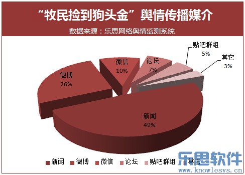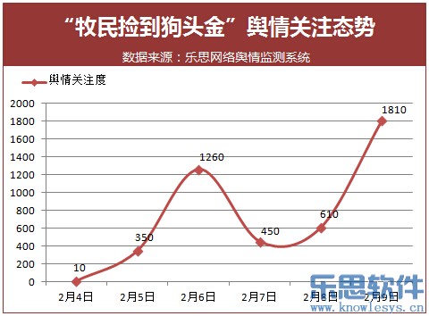 据乐思网络舆情监测系统数据显示,“牧民捡到狗头金”一事自2月4日起开始在网络传播,经过新闻媒体的广泛转载和报道,事件舆情关注度逐渐上升,网友纷纷围绕“狗头金归属”问题进行热议。6日,事件舆情关注度达到第一个小高潮,之后有所回落。随后在青河县文物局和青河县政府对事件进行回应后,事件舆情关注度又迅速上升,在9日达到第二个高潮。在整个事件的传播过程中,新闻媒体成为了主要的传播载体,媒体对事件进行了大量的报道,而网友也在微博、微信、论坛贴吧等社交平台进行讨论,新闻报道下面的跟帖留言亦不少。