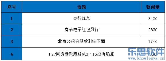 据乐思舆情监测中心金融行业热点话题版块数据显示:本周金融行业舆情话题关注度最高的是“央行降息”。该话题一周相关新闻报道量约8430篇,位居金融行业热点话题排行榜第一位。“春节电子红包”、“北京公积金贷款利率下调”分别居金融行业热点话题排行榜第二、三位。此外,“P2P网贷卷款跑路成3·15投诉热点”这一消息也较受关注。