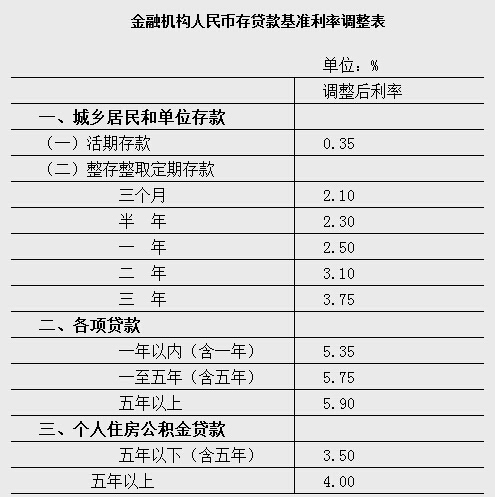 2月28日,中国人民银行发布通告,决定自2015年3月1日起下调金融机构人民币贷款和存款基准利率。金融机构一年期贷款基准利率下调0.25个百分点至5.35%;一年期存款基准利率下调0.25个百分点至2.5%,同时结合推进利率市场化改革,将金融机构存款利率浮动区间的上限由存款基准利率的1.2倍调整为1.3倍;其他各档次存贷款基准利率及个人住房公积金存贷款利率相应调整。
