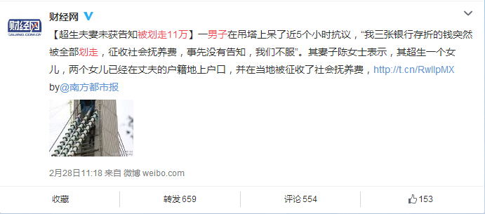 据南方都市报报道,2月27日下午,中山市区光明桥,一名男子危坐在10多米高桥顶,抗议计生部门从其银行里划扣11万元,用作缴纳抚养费,并在吊塔上呆了近5个小时。其妻子陈女士表示,其超生一个女儿,两个女儿已经在丈夫的户籍地上户口,并在当地被征收了社会抚养费,“年二十八,我三张银行存折的钱突然被全部划走,征收社会抚养费,事先没有告知,我们不服”。