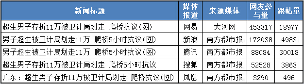 在新闻报答方面,南方都市报报道曝出后,被新浪、凤凰、搜狐、网易、腾讯、大河网、人民网、新华网、大众网等众多门户和主流媒体网站转载报道。其中网易新闻转自大河网题为《超生男子存折11万被卫计局划走 爬桥抗议》的报道吸引453317人参话题,跟帖达18977条;新浪网该篇相关报道也有高达172038人参与,吸引评论4983条。据统计数据显示,仅网易、凤凰、新浪、腾讯、搜狐五家门户网2月27日的五篇单篇报道就招来769257人参与议论,吸引跟帖58337条,可谓舆论关注度之高。但近两日关于该事件的新闻报道快速减少,事件舆情开始走向平息。