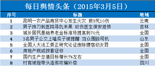 导语:据乐思网络舆情监测系统3月5日对全网舆情监测数据显示,当天舆论关注度较高的舆情事件有8件,分别为:昆明一农产品商贸中心发生火灾、男子持刀到医院寻仇、城乡居民基础养老金标准将提高、3名男子公交上当众围殴司机、废除嫖宿幼女罪、房地产税或按套征收、国内生产总值目标增长7%左右、村官造假坟骗补偿……