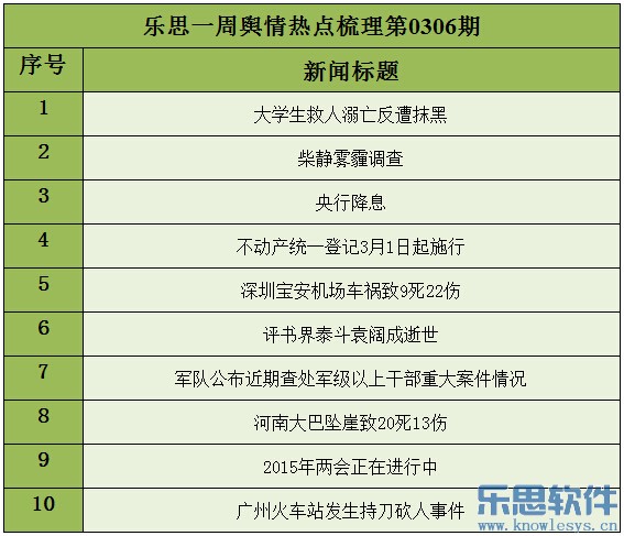 导读:2015年3月6日乐思一周舆情热点:大学生救人溺亡反遭抹黑;柴静雾霾调查;央行降息;不动产统一登记;深圳宝安机场车祸致9死22伤;河南大巴坠崖致20死13伤;2015年两会……