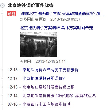 12月14日,北京晨报一篇“北京地铁高峰段票价将差别化”的报道再次引来舆论对北京地铁涨价话题的关注。由于这次报道信息来自北京政府官方,票价差别化得到证实,由此拉开了北京地铁涨价舆情热议的序幕。