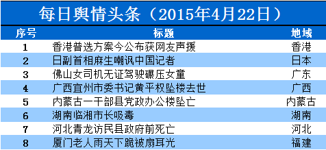 导语:据乐思网络舆情监测系统4月22日对全网舆情监测数据显示,当天舆论关注度较高的舆情事件有8件,分别为:香港普选方案、麻生嘲讽中国记者、佛山女司机碾压女童、黄平权坠楼去世、内蒙古一干部坠亡、湖南临湘市长吸毒、青龙访民县政府前死亡、老人雨天下跪被扇耳光……
