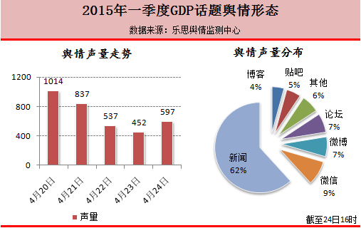摘要:近日,全国各省市陆续公布本省区2015年第一季度GDP数据受到网友关注围观。4月24日,媒体再次报道24省一季度GDP成绩单引发舆论热议潮,当天百度实时热点榜“各省份一季度GDP”搜索指数高达455022次。对于GDP增速的普遍下降,舆论反应相对淡定,不少网友质疑其存在水分。