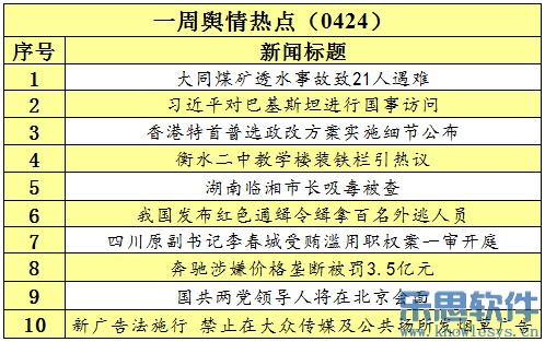 导读:2015年4月24日乐思一周舆情热点:大同煤矿透水事故致21人遇难;习近平对巴基斯坦进行国事访问;香港普选方案公布;衡水二中教学楼装铁栏;湖南临湘市长吸毒……