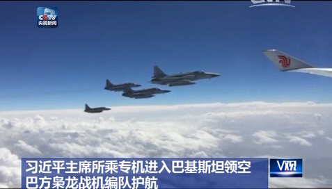 4月20日上午,国家主席习近平乘专机离开北京,应巴基斯坦伊斯兰共和国总统侯赛因和总理谢里夫邀请,对巴基斯坦进行国事访问。在习近平所乘的波音747专机进入巴基斯坦领空后,巴方出动枭龙战机编队护航。