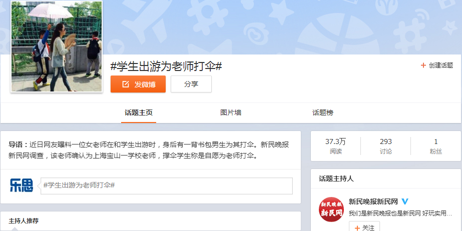 4月30日网友“@hellhell”曝光“学生出游为老师打伞”事件后,立即在微博上引起广泛的关注和讨论。截至5月5日,该条原发微博被转发2941次,获得评论739条,获赞347次。随着该条微博的被疯转,5月4日,“小学生为老师辛苦打伞,女子表情全程霸气”被顶上微博热门话题榜。5月5日,微博话题#学生出游为老师打伞#被阅读37.3万人次,吸引讨论293条。