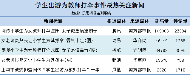 在媒体传播方面,5月5日,新民晚报、南方都市报、华商网等媒体开始关注报道“学生出游为老师打伞”事件,并引来了腾讯、网易、新浪、凤凰、搜狐等大型新闻网站和门户的转载,吸引大量网友的关注评论。其中腾讯新闻题为《网传小学生为女教师打伞遮阳 女子戴墨镜拿扇子》的报道吸引109003人参与话题,获得跟帖评论23394条。因为媒体的报道,该话题5日舆情关注度不断上升和发酵。